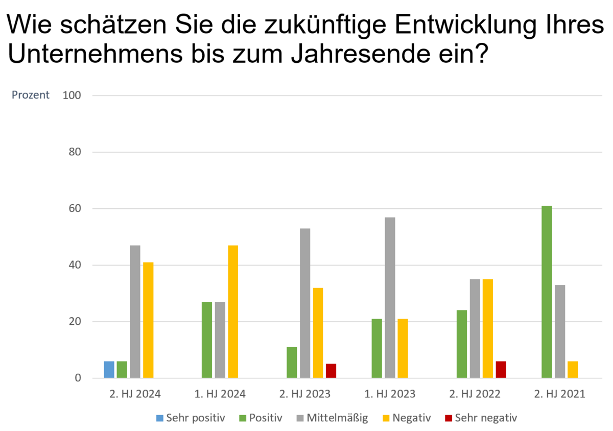 Die Zahlen der aktuellen VOA-Umfrage sprechen für sich. Ende des zweiten Halbjahres 2024 schätzen 47 % der an der Umfrage teilnehmenden ordentlichen Mitglieder die Entwicklung ihres Unternehmens als mittelmäßig ein, 41 % als negativ. Sehr positive oder positive Meinungen gibt es mit jeweils 6 % nur wenige. Verglichen mit den Ergebnissen aus dem ersten Halbjahr – je 27 % positiv und mittelmäßig, 47 % negativ – entwickelten sich die Zahlen demnach bei 12 % der VOA-Mitgliedsunternehmen besser als erwartet, bei 15 % etwas schlechter als erwartet.