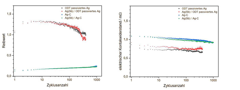 Für die Beurteilung der Steckzyklenbeständigkeit werden die in Abb. 1 a) abgebildeten Schichtsysteme auf Platten-Prüfkörpern, siehe Abb. 1b), verwendet. Als Prüfgegenkörper fungieren Silberkugeln mit einem Durchmesser von 3 mm. Die Prüfkörper wurden bei 23 °C für jeweils 1000 Zyklen bei einer Normalkraft von 1,5 N, einer Testfrequenz von 1 Hz, einer Auslenkungsamplitude von 500 µm und einem Prüfstrom von 100 mA im tribologischen Prüfstand getestet. Die entsprechenden zyklenaufgelösten Messdaten des Reibwertes sowie des elektrischen Kontaktwiderstandes sind in Abb. 3 dargestellt. Abbildung 3 a) zeigt, dass der initiale Reibwert der beiden mit Silber-Graphit als Endschicht beschichteten Prüfkörper initial zwischen 0,1 und 0,2 liegt. Mit fortschreitender Anzahl an Testzyklen steigt die Reibzahl linear auf etwa 0,26 nach 1000 Testzyklen. Die mit ODT passivierten Feinsilber-Schichtsysteme zeigen mit etwa 1,1 initial eine deutlich höhere Reibzahl, die innerhalb der ersten Zyklen auf etwa 1,3 ansteigt, nach etwa 30 Zyklen anfängt zu fallen und nach 400 Zyklen etwa 0,9 (Antimon-haltiges Hartsilber / Feinsilber Schichtsystem) bzw. 1,1 (Feinsilber-Schichtsystem) erreicht, damit aber sehr deutlich oberhalb der Silber-Graphit Systeme liegt. Die mit Silber-Graphit beschichteten Prüfkörper zeigen aufgrund der Schmierung durch Graphit nach 1000 Testzyklen keinen Hinweis auf Verschleiß. Dies zeigt sich auch in den in-situ durchgeführten, zyklenaufgelösten Messungen des Kontaktwiderstandes. Bei den beiden mit Silber-Graphit als Endschicht beschichteten Prüfkörpern zeigt sich, dass der initial gemessene Kontaktwiderstand bei etwa 1,1 mΩ liegt und mit fortschreitender Zyklenanzahl linear abfällt bis er nach 1000 Zyklen bei etwa 0,9 mΩ liegt – analog zum Reibwert. Das bedeutet, auch in Bezug auf den elektrischen Kontaktwiderstand ergibt sich für die Schichtsysteme mit Silber-Graphit als Endschicht kein Hinweis auf wesentlichen Verschleiß. Bei den Silber-Referenzsystem verhält sich der Kontaktwiderstand ähnlich. Der initiale Kontaktwiderstand sinkt von 0,9 mΩ auf etwa 0,8 mΩ.