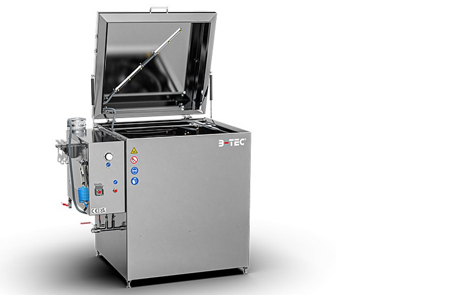 Mit Hilfe des serienmäßigen B-TEC-Absaugsystems werden gefährliche Dämpfe umgehend aus dem Gerät abgesaugt, sobald die Geräteklappe geöffnet wird. Der Anwender wird bestmöglich geschützt und der Kontakt mit Lösemitteln wird im Vergleich zu aufwendiger manueller Reinigung massiv reduziert.